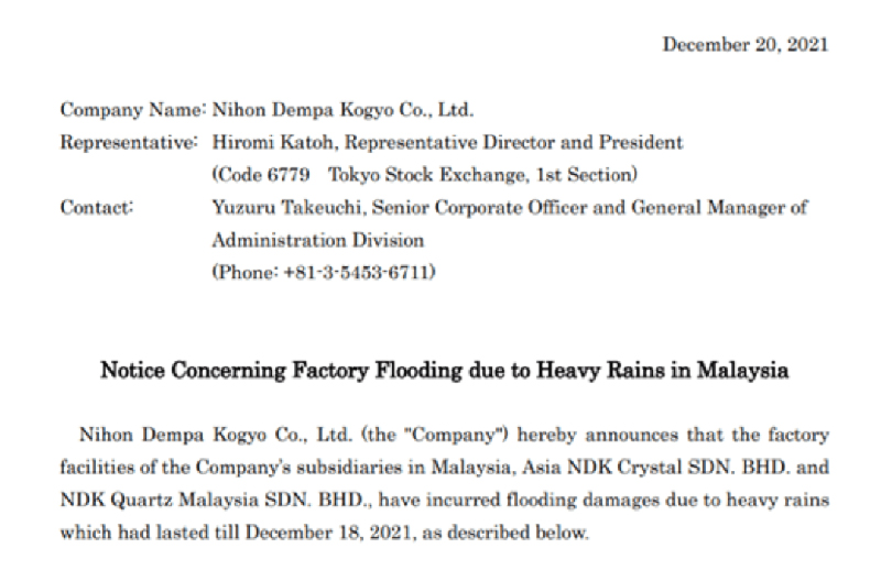 NDK指出,此次因淹水而進(jìn)行停工的為旗下子公司”Asian NDK Crystal SDN. BHD.(以下簡(jiǎn)稱(chēng)ANCSB)”和”NDK Quartz Malaysia SDN. BHD.(以下簡(jiǎn)稱(chēng)NQMSB)”,目前廠房已進(jìn)行抽水、恢復(fù)作業(yè),不過(guò)由于大量生產(chǎn)線被淹,預(yù)計(jì)生產(chǎn)恢復(fù)要需要一段時(shí)間。